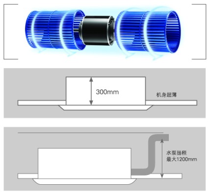 配置先進的高揚程冷凝水泵,可將室內(nèi)機制冷時產(chǎn)生的冷凝水提升最大可達
