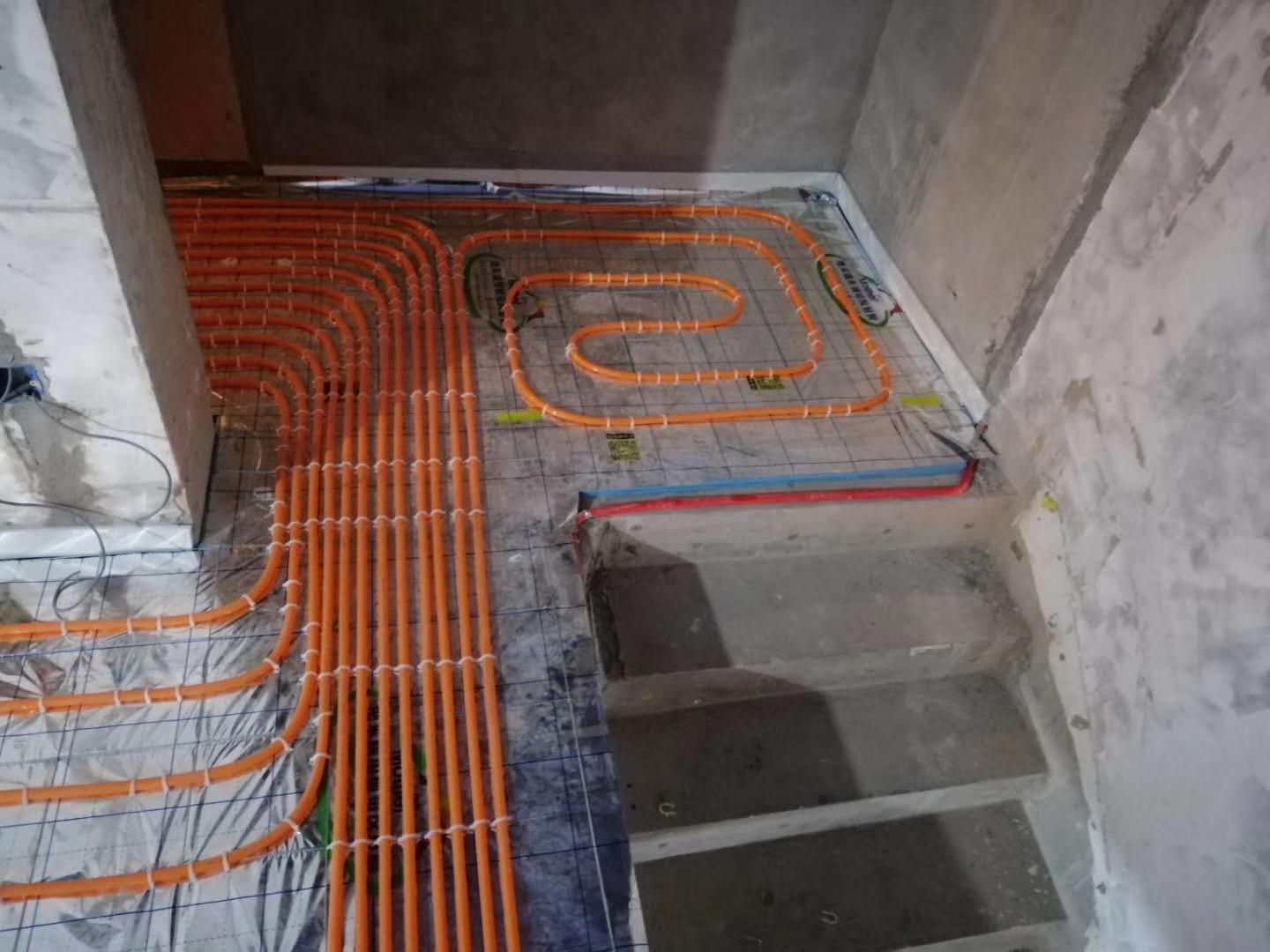 第一步是鋪設(shè)保溫板和反射膜。在我們把地面清理干凈以后,首先在原有地面上鋪我們選擇的擠塑板,擠塑板一定要鋪得平整嚴(yán)密,然后用膠帶進行固定。在擠塑板的上面開始鋪反射膜,反射膜要鋪嚴(yán),反正膜交接的地方同樣也要使用膠帶進行固定。第二步是鋪底層鋼筋網(wǎng)片。鋼筋網(wǎng)片的規(guī)格一般是10mm×10mm,鋼筋網(wǎng)片所使用鋼筋的直徑一般是3mm。鋪設(shè)鋼筋網(wǎng)片的目的也就是為了固定我們的地盤管,防止位移以及澆筑混凝土?xí)r出現(xiàn)的管道的上浮等情況。第三步是鋪地采暖的地盤管道。地采暖的地盤管道就是地采暖的地盤管的安裝,具體安裝的時候是從分集水器開始,按照我們的設(shè)計要求鋪設(shè)每個房間的地采暖管道。這里要求的是管道之間的間距要符合要求,另外每個回路的長度要大概一致。此外單個的長度盡量要控制在100米以內(nèi)。最后使用扎帶把地才能管道與鋼筋網(wǎng)片進行固定。第四步是鋪設(shè)上層鋼筋網(wǎng)片。在地采暖管道鋪設(shè)完成以后,我們需要在地采暖管道的上層再鋪設(shè)一層鋼筋網(wǎng)片。鋪設(shè)這層鋼筋網(wǎng)片的作用是防止我們的后澆層出現(xiàn)開裂。在鋪設(shè)完上層鋼筋網(wǎng)片以后,一定要把上下層鋼筋片使用扎帶進行固定牢固。第五步是澆筑回填層的混凝土。回填撐死凝土的厚度一般來說都是60mm左右,混凝土的強度一般都是C20的豆石混凝土。在澆筑的時候一定要注意防止地采暖管道出現(xiàn)位移和上浮的情況。澆筑完成以后要及時養(yǎng)護,以防止造成地面的開裂。